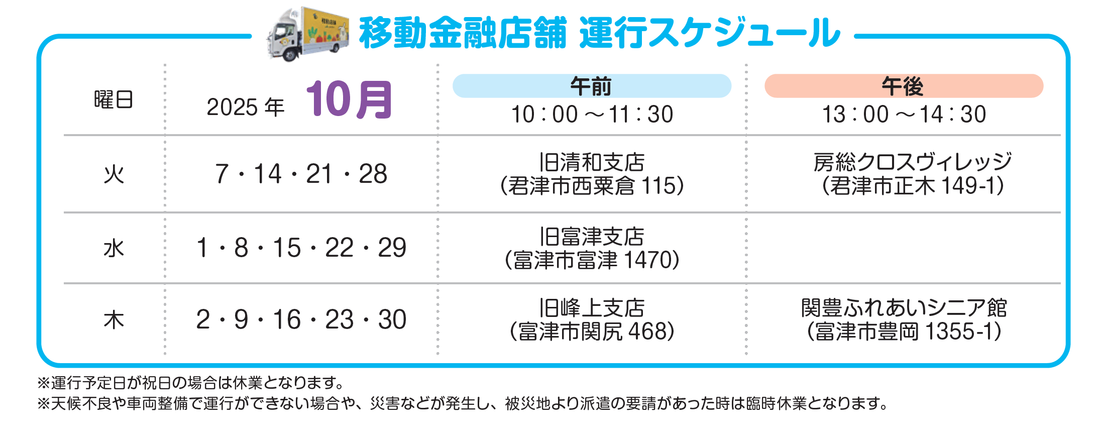 JAきみつでは、旧店舗跡地などに金融窓口機能と購買品を搭載した移動金融店舗車の運行をしています。
