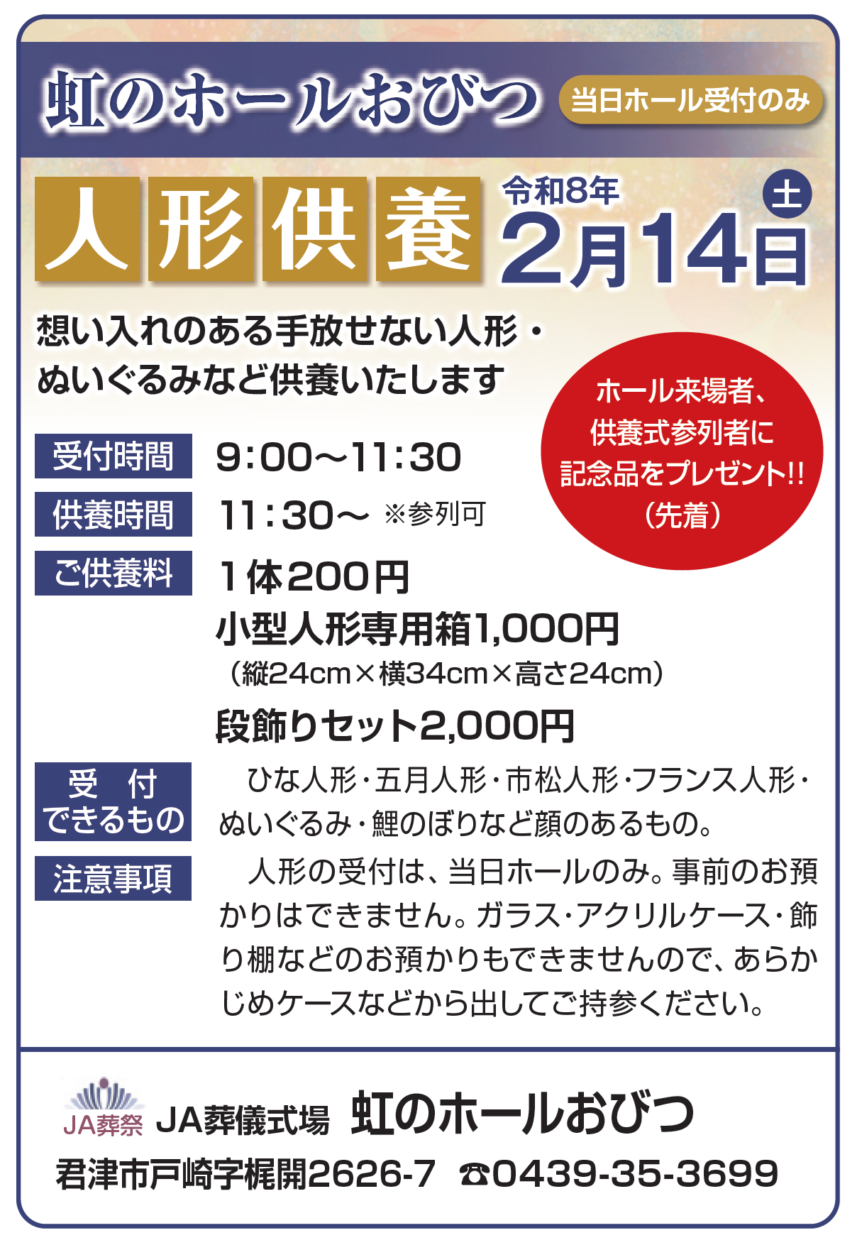 【2月14日(土)】虹のホールおびつ人形供養開催のお知らせ